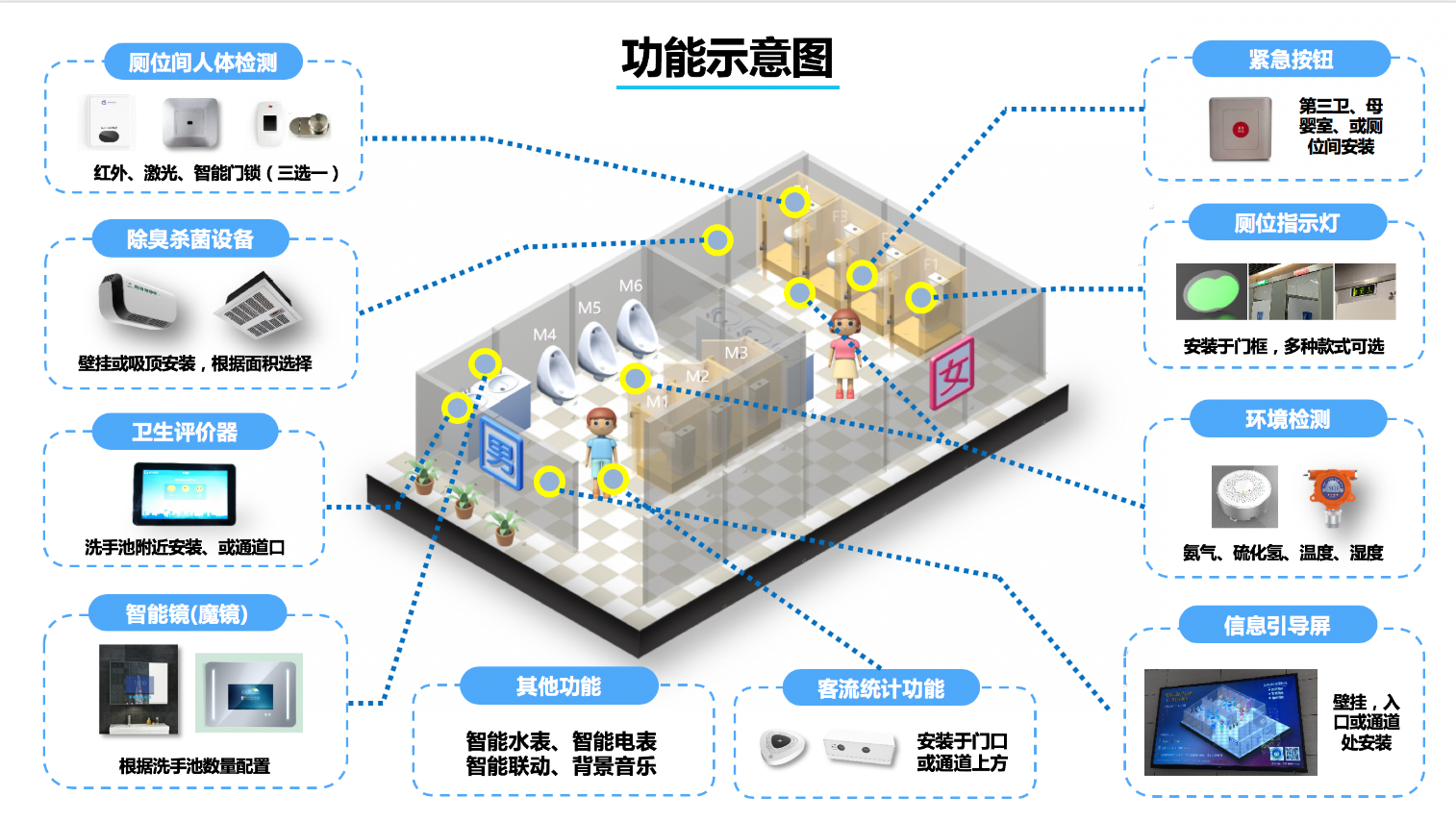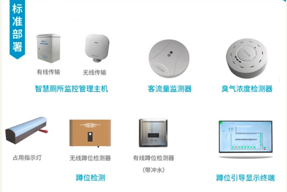 安装在厕所门口,方便使用者直观了解该厕所的厕位占用情况、厕内空气指数、人流量等动态,引导使用者第一时间找到合适的厕位,有效提高厕位的利用率,缓解厕所压力。 智慧厕所设备总览智慧厕所设备总览